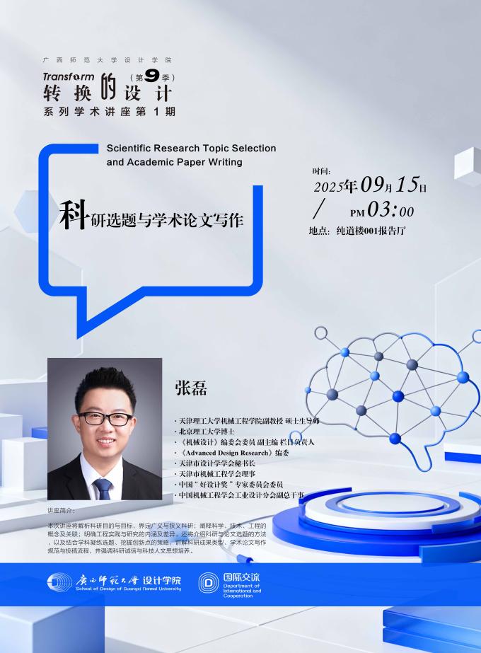 近日,设计学院“转换的设计”系列学术讲座第九季第1期在纯道楼001学术报告厅顺利举行。此次讲座特邀天津理工大学机械工程学院张磊副教授,带来《科研选题与学术写作》的精彩分享,由学院副院长刘世军与梁惠萍教授共同主持,学院教师及研究生代表踊跃参与。