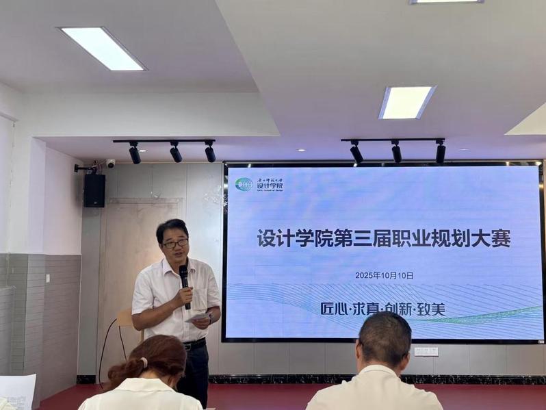10月10日,设计学院于雁山校区容园社区研究生活动中心顺利举行第三届全国大学生职业规划大赛选拔赛。本次大赛旨在引导学生科学规划职业生涯,提升就业竞争力,为学生的未来发展点亮明灯。本次活动特邀学院党委书记周飞、副书记刘伶,工业设计系马玮岐老师、国际交流合作部董孟雅老师及辅导员代表担任评委,以专业视角为选手们把关。30余名本研学生踊跃参与,经过激烈角逐,3名选手脱颖而出,成功晋级学校决赛。