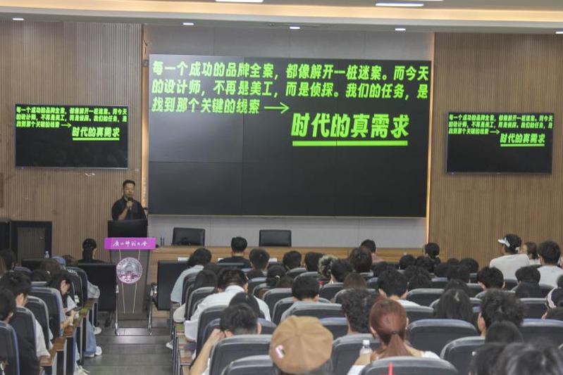 谈及行业趋势,梁益剖析了Z世代等新兴消费群体需求特点。他强调,设计已从单向模式转向以用户为中心,需借助大数据梳理需求、场景模拟预判痛点,解决用户未满足诉求。结合自身经历,他建议新生在大学期间要筑牢专业基础,熟练掌握设计软件与理论;主动参与实践项目,积累经验;培养跨界思维与团队协作能力,保持学习热情、拓宽视野,以适应市场竞争。讲座现场互动热烈,梁益耐心解答,学生收获颇丰。