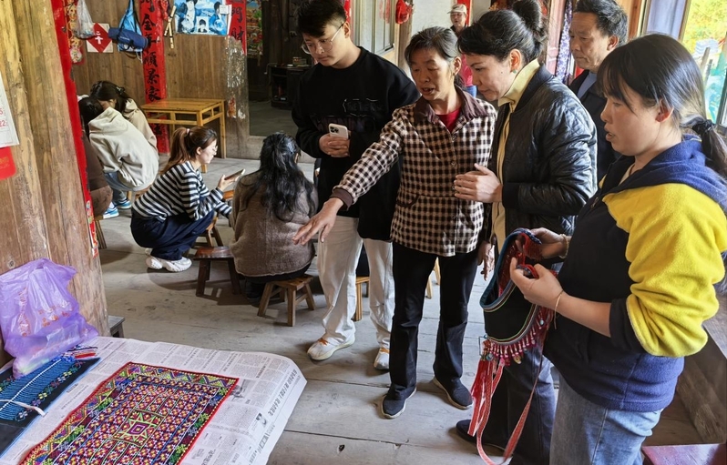 师生党员们对猴背村瑶绣的传承现状进行了专题调研。通过走访瑶绣手艺人、观摩绣制过程、进行深度访谈等形式,团队系统地收集了第一手资料,深入了解瑶绣的工艺特点、传承谱系以及在当代社会下面临的困境。此次调研为设计学院后续开展非遗研究、课程开发以及设计介入非遗创新转化积累了宝贵的案例。