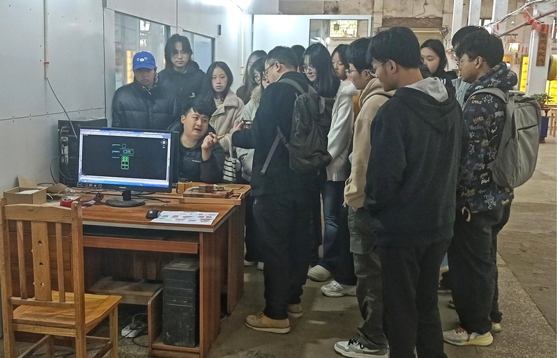 桂林蓝天智慧工坊设计总监蒋工与市场销售部陈工热情接待了师生一行。陈工首先介绍了工坊的发展历程与主营业务。随后,设计总监蒋工系统讲解了CAD设计思维与方法,并结合木板激光切割工艺,现场演示了激光切割加工过程,生动呈现了基于该工艺的文创产品从设计到制造生产的全流程。