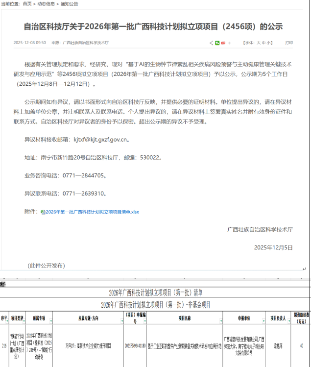 近日,广西壮族自治区科技厅传来喜讯,由我院梁惠萍教授牵头申报的“基于工业互联的塑件产业智能装备关键技术研发与应用示范”项目,获得2026年度广西科技计划拟立项公示,获批经费40万元。这是我院首次在该类别项目中实现零的突破,标志着学院科研工作在服务区域创新驱动发展战略中迈出关键一步。